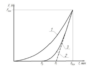 При вдавливании алмазного индентора в поверхность образца фиксируется максимальное значение заданной нагрузки Fmax. Зависимость приложенной нагрузки к индентору от глубины его проникновения в поверхность испытуемого образца (линия 1 рис. 3) появляется автоматически на мониторе испытательной машины. При измерениях индентор внедряется в испытуемую поверхность образца на минимальную глубину 50 мкм. Затем после выдержки индентора под нагрузкой в течение 15 с осуществляется полная разгрузка образца с получением графической зависимости (линия 2 рис. 3). По полученной линии 2 графически строится касательная линия 3 при нагрузке Fmax.