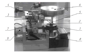 К подвижной (верхней) траверсе крепилось приспособление, в которое устанавливался алмазный индентор Виккерса, а на неподвижную (нижнюю) траверсу устанавливался испытуемый образец (рис. 4)12 [18; 19].