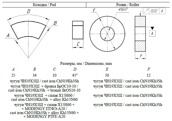 пара трения 2: ролик – чугун ЧН19Х3Ш; колодка чугун ЧН19Х3Ш с ЭИО из бронзы БрОС10-10 / friction pair 2: roller – cast iron ChN19Kh3Sh; pad ‒ cast iron ChN19Kh3Sh with elektrospark alloying bronze BrOS10-10 | |||||