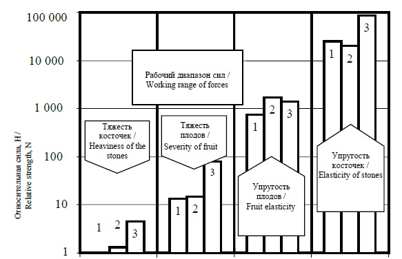 Установлено, что исследуемые величины сил отличаются друг от друга в 100 000 раз. Определен рабочий диапазон сил, который реализуется в дробилке. Он должен быть больше предела упругости плодов, чтобы измельчить мякоть, и меньше предела упругих деформаций косточек, чтобы сохранить косточки целыми. Из рисунка 4 видно, что при анализе процесса измельчения мякоти плодов зизифуса силами тяжести плодов и косточек можно пренебречь.