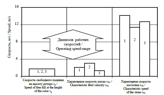 В результате проведенного эксперимента определено, что если нормальная составляющая скорости плода меньше характерной скорости плода относительно ребер, то плод отскакивает от твердой поверхности, если наоборот, то кожица плода повреждается, отделяется частица мякоти, а если скорость больше, то мякоть измельчается, а косточка отделяется. Если относительная скорость косточки меньше характерной скорости косточки, то косточка отскакивает от ребра без повреждений скорлупы. В противном случае возможно разрушение косточки.