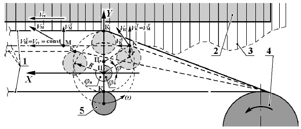 Постоянное соблюдение условия (1) происходит в результате комплексного воздействия шкива 4 и активаторов 5 на комлеподбивающую поверхность 1. Поскольку ролики активаторов 5 свободно вращаются на своих осях, то они не оказывают влияния на характер движения КП в направлении оси X. Благодаря такой конструкции рабочая поверхность 1 относительно движущегося слоя совершает незатухающие гармонические колебания только в направлении осей стеблей (ось Y), и вся энергия удара будет расходоваться только на выполнение полезной работы по сдвиганию стеблей в осевом направлении. При этом встречный удар возможен в той части периода, когда направление движения поверхности 1 совпадает с положительным направлением оси Y (рис. 3). Для определения вероятности нанесения встречного удара проанализируем движение точки М комлеподбивающей поверхности 1.