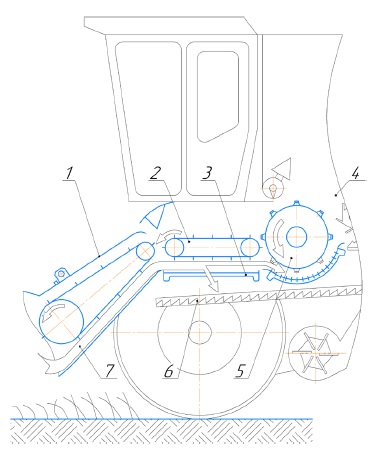 4 – комбайн; 5 – барабан молотильный; 6 – транспортная доска; 7 – очесанный зерновой ворох