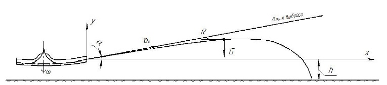 где vo – абсолютная скорость схода гранул с диска, м/с; α – угол схода гранул относительно горизонта, град; g – ускорение свободного падения, м/с2; h – высота установки рабочего органа, м.