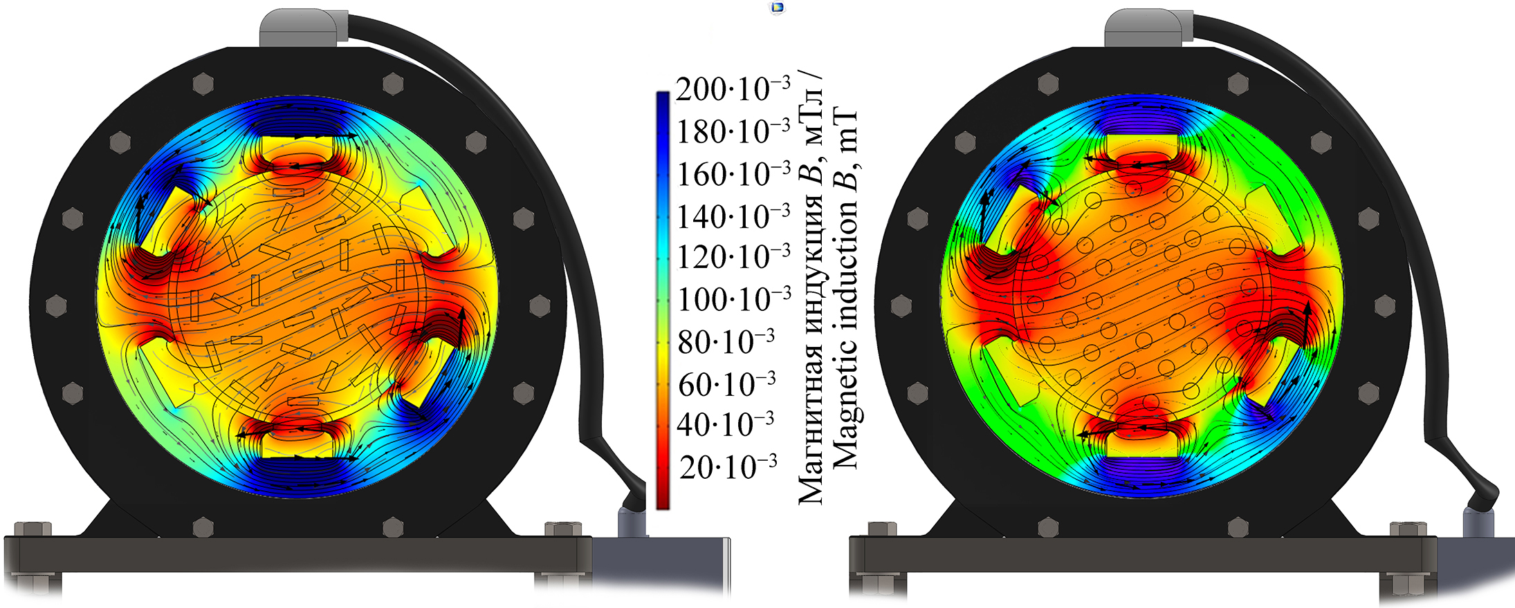 Анализ результатов, представленных на рисунке 2, позволил сделать следующие выводы: при минимальной массе ферромагнитных стержневых рабочих тел уровень магнитной индукции составляет В ≈ 38–40 мТл, при максимальной В ≈ 54–57 мТл, при минимальной массе шаровых ферромагнитных рабочих тел В ≈ 50 мТл, при максимальной В ≈ 68–72 мТл [35]. Был сделан вывод о наибольшей перспективности использования шаровых ферромагнитных рабочих тел в качестве физического активатора.