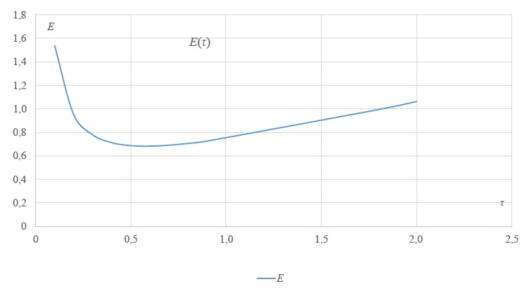 откуда τопт = 0,58. Отметим, что полученный параметр τопт не зависит от xк. Зависимость энергии E от параметра τ при x = 0,5 показана на рисунке 3. Спадающий в положительном направлении τ участок функции E(τ) характеризует эффективные по быстродействию и энергозатратам режимы [18]. Оптимальное в программном движении решение с τопт = 0,58 дает 9,3 % относительной экономии энергии, по сравнению с управлением в разомкнутой системе с τ = 1, что существенно ниже 30,7 % экономии энергии при оптимальном программном управлении, но при программном движении обеспечивается устойчивость конечного состояния.