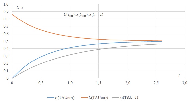 Постоянные интегрирования определяются из граничных условий. Пусть x1(0) = 0, x1кон = 0,5 при T = 2. Графики переходных процессов для координаты x1*(t) = 0,069(et + e–t) и оптимального программного управления U *(t) = 0,138e t приведены на рисунке 1. При этом затраты энергии что на 30,7 % меньше, чем энергозатраты в разомкнутой системе с управлением U*(t) = 0,5 на интервале времени t [0, 3]. Но аналитически выразить U* через x1* из-за трансцендентности невозможно, к тому же нужно будет дополнительно решать задачу стабилизации конечного состояния.