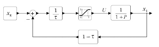 Структура позиционной системы управления, квазиоптимальной по быстродействию и энергозатратам, полученная из (12) с τопт и технически просто реализуемая, приведена на рисунке 5. Если граничные условия xк > τопт или τмин > τопт, то xк > τопт или τмин > τопт, то для ограничения амплитуды управления введено звено насыщения с линейным участком единичного наклона в диапазоне [0, 1].
