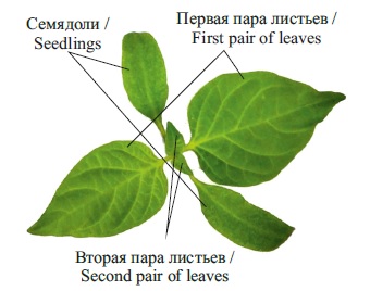 На рисунке 5 показан вид типичного растения перца, сформировавшегося на момент окончания эксперимента. Размеры первой пары настоящих листьев позволяют произвести измерения их оптической плотности.