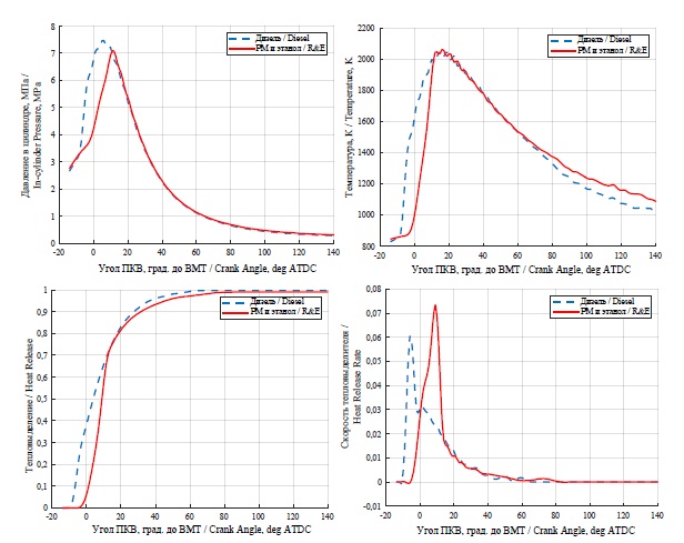 Если начало горения можно было четко определить по отрыву индикаторной диаграммы от кривой сжатия, то определение продолжительности горения имеет существенную погрешность. Тем не менее можно достоверно определить, что, несмотря на позднее начало сгорания, продолжительность сгорания при работе двигателя на этаноле и РМ увеличивается от 8 до 30 %.