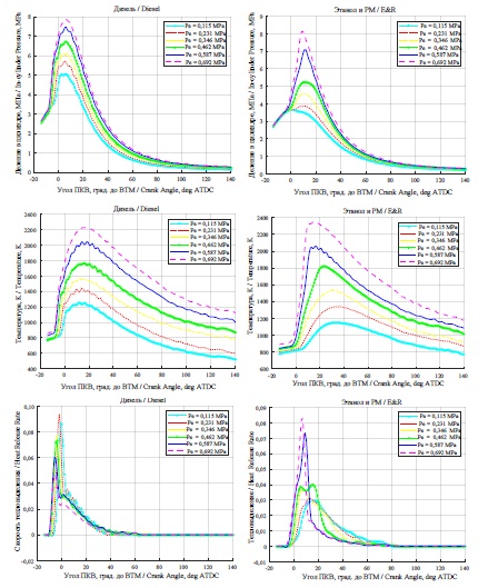 В ходе экспериментальных исследований проводилось индицирование рабочего процесса с помощью пьезокварцевого датчика давления, установленного в головке цилиндра, измерение расхода топлива и потребления воздуха, отбирались пробы ОГ для исследования состава газа, определялось содержание токсичных компонентов и дымности. Полученная от датчика давления многоцикловая индикаторная диаграмма усреднялась путем наложения сигнала за 10-секундный испытательный цикл с периодом в два оборота коленчатого вала двигателя. Для корректного наложения графиков использовался индуктивный датчик верхней мертвой точки (ВМТ). По осредненной индикаторной диаграмме определяли среднее эффективное давление, частоту вращения коленчатого вала, осредненную температуру газов в цилиндре, тепловыделение. По измерениям весов определялась точная цикловая подача этанола и рапсового масла. Анализ внутрицилиндровых процессов проводился в сопоставлении с традиционным дизельным процессом. При проведении испытаний на дизельном топливе на двигатель были установлены серийные головки цилиндров.