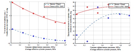 Несмотря на рост УУОВТ на 4 градуса ПКВ, максимальное давление газов в цилиндре достигается на всем диапазоне нагрузок позже, чем на штатном двигателе (рис. 6). При этом максимальное давление газов в цилиндре ниже при всех нагрузках, кроме максимальной. На рисунке 7 показаны границы начала горения в цилиндре и общая продолжительность сгорания.