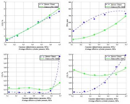 - Использование этанола и РМ позволяет существенно улучшить экологические показатели работы дизеля как на номинальном, так и на форсированных режимах и в разы снизить дымность ОГ. При этом на треть снижаются выбросы оксидов азота и продукты неполного сгорания.