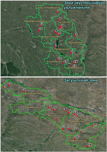 Note. 1 – Malaya Dzhalga; 2 – Kievka; 3 – Divnoe; 4 – Sadovoye; 5 – Rodnikovskoye; 6 – Petropavlovskoe; 7 – Arzgir; 8 – Chograyskoye; 9 –Turksad; 10 – Levokumskoye; 11 – Priozernoye; 12 – Urozhaynoe; 13 – Burgun-Majary; 14 – Zimnaya Stavka; 15 – Achikulak; 16 – Tukui-Mekteb; 17 – Neftekumsk.