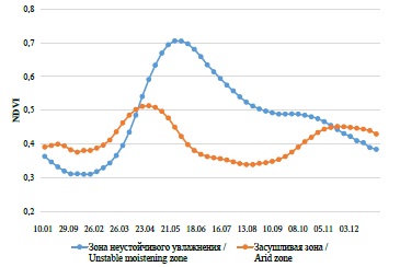 Проведенный анализ показал, что в зоне неустойчивого увлажнения максимум NDVI приходится на 21 мая, а в засушливой – на 23 апреля. Кроме того, значение максимума в первой зоне на 37,4 % больше, чем во второй (0,7056 и 0,5135 соответственно). В среднем с мая по ноябрь вегетационный индекс в зоне неустойчивого увлажнения на 46,8 % больше, чем в засушливой зоне. Следует отметить, что в осенний период, когда в засушливой зоне на фоне осадков устанавливается относительно теплая погода, отмечается явно выраженное повышение NDVI травянистой растительности, чего не наблюдается в зоне неустойчивого увлажнения.