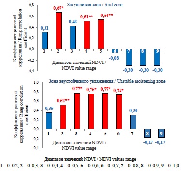 В зоне неустойчивого увлажнения наиболее высокие коэффициенты ранговой корреляции между степенью деградации и площадью, занимаемой травянистой растительностью с определенным значением вегетационного индекса, наблюдается в случае с NDVI, находящимся в пределах 0,0–0,4 (р = 0,01), а в засушливой 0,0–0,3 (р = 0,01).