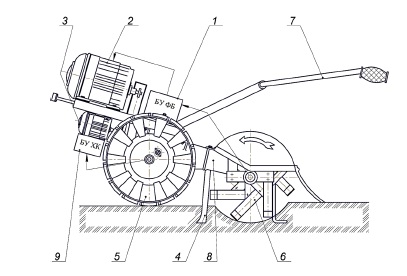 2 – электродвигатель привода рабочих органов; 3 – электродвигатель привода ходовых колес;