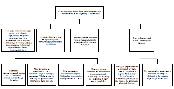 На основе систематизации описанных выше этапов и их приложения к исследованию предметной области «предварительная настройка жатвенной части комбайна» предложен метод решения задачи выбора оптимальных начальных значений параметров рабочих органов агрегата. Иерархия составляющих метода включает несколько уровней и приведена на рисунке 1. Далее рассмотрим подробно отдельные элементы данной структурной схемы.