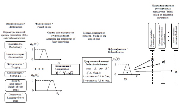 Предлагаемый подход к формированию метода предварительной настройки регулируемых параметров жатвенной части базируется на математическом аппарате нечеткой логики и в общем виде состоит из этапов фаззификации, композиции и дефаззификации [11; 15]. Далее остановимся подробно на каждом из них.