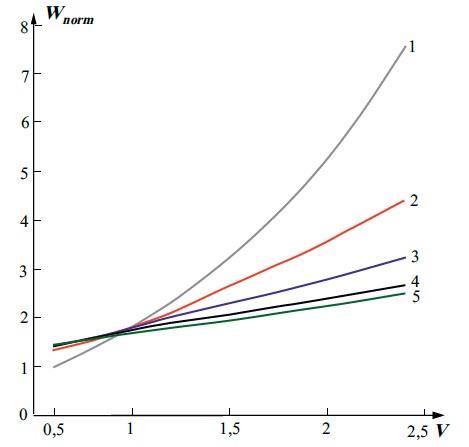 Как видно из рисунка, при изменении параметра V от значения 0,5 до 2,405, согласно формуле (11), нормированная энергия Wnorm растет от 1 до Wnorm(max) ≈ 7,5 для профиля с n=1, до Wnorm(min) ≈ 2 для профиля с n = 5. Для всех рассмотренных профилей значения соответствующих энергий превышают энергии ступенчатого профиля для соответствующих значений параметра V. Исключая мало применяемый профиль с n=1, видим, что наиболее энергоэффективным из всех степенных профилей оказывается профиль с n = 1, что подтверждается экспериментальными данными4.