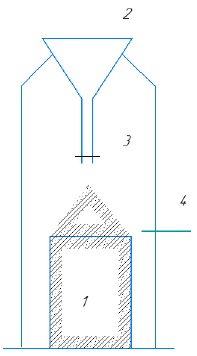 The dry material is poured into the funnel, then the valve is opened, the cylinder is filled with excess, the bolt is closed and the excess material is cut off from the middle to both sides with a metal ruler on a level with the cylinder edges. The material may not be compacted (Fig. 7–9). The cylinder with the material is then weighed within to 1 g. The tests are carried out in 3 repeats.