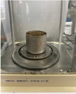 The humidity of the examined material was determined by a standard technique adapted to the raw material. The humidity of the biomass is determined by the adapted arbitration method according to GOST 13496.3-92. The weighting cup prepared for the study was placed in the drying cabinet for pretreatment 103°С within 30 minutes. The sample was weighed to within 1 mg. Then the samples with the analyzed mass are sent into the drying cabinet, preheated to 103°С, presented in Figure 3.