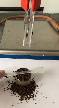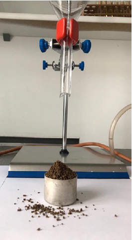 Prior to testing, a pre-weighed measuring cylinder should be installed under the tube. The distance between the upper edge of the cylinder and the valve shall be 50 mm (Fig. 6). The material must be pre-dried and weighed.