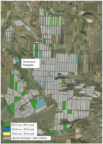 Чтобы проверить возможность использования данных дистанционного зондирования для оценки состояния растений в производственных условиях, были проанализированы результаты исследований, полученные при изучении полей в осенне-весенний период в ЗАО «СХП “Родинаˮ» Шпаковского района, расположенного в зоне неустойчивого увлажнения Ставропольского края. Они были проведены в рамках выполнения хоздоговорных работ по научному обеспечению производства зерна озимой пшеницы (2013, 2014 и 2016 годов). Нами была выполнена оцифровка всех полей с озимой пшеницей в каждый год исследований. С помощью сервиса «ВЕГА» ФГБУН «ИКИ РАН» были получены данные ДЗЗ соответствующих полей и в даты, близкие к датам проведения отборов растительных образцов (NDVI, RED и NIR).