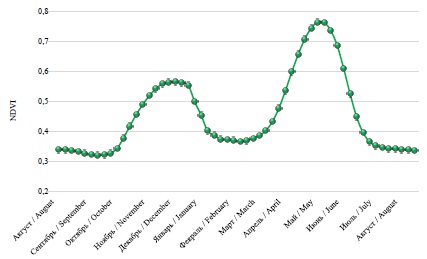 Спутниковый сервис «ВЕГА» позволяет использовать информацию, полученную с общедоступных данных дистанционного зондирования [20]. Значения нормализованного разностного вегетационного индекса NDVI сельскохозяйственных культур получены по данным спутника «Терра» (MODIS) [21].