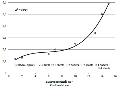 Вегетационный индекс Normalized Difference Vegetation Index (NDVI) на опытных делянках определяли с помощью ручного прибора GreenSeeker (Trimble, США). Измерения проводили каждые 2-3 дня (не менее четырех замеров на каждой повторности). Одновременно с этим определяли высоту побегов и кустистость растений. По полученным данным была построена зависимость, где y ‒ NDVI, x ‒ высота растений.