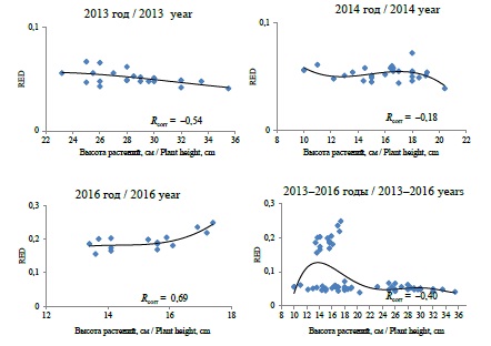 При анализе связи высоты растений и коэффициентов спектральной яркости в красной области спектра электромагнитных волн (RED) коэффициенты корреляции составили значения −0,54 в 2013 г., –0,18 в 2014 г. и 0,69 в 2016 г., по объединенным данным за период 2013‒2016 гг. – минус 0,40. Это объясняется тем, что RED напрямую связан с максимумом поглощения хлорофилла, а у растений нет прямой зависимости их высоты от количества зеленых пигментов.