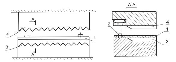 Нагретая до 1 000 °С пластина заготовки 1 фиксируется штифтами 2 в полости зубчатой матрицы 3. Пуансон штампа с зубьями, выполненными зеркально зубьям матрицы 4, при срабатывании траверсы пресса формирует режущие грани ножа. Финишная обработка граней ножа осуществляется многофрезерной оснасткой в два прохода по каждой стороне ножа.