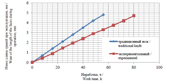 Предельного состояния экспериментальные ножи достигают после наработки 80 часов, что говорит о повышении показателя их долговечности на 27–30 %, причем за этот период разрушению подвергся 1 нож.