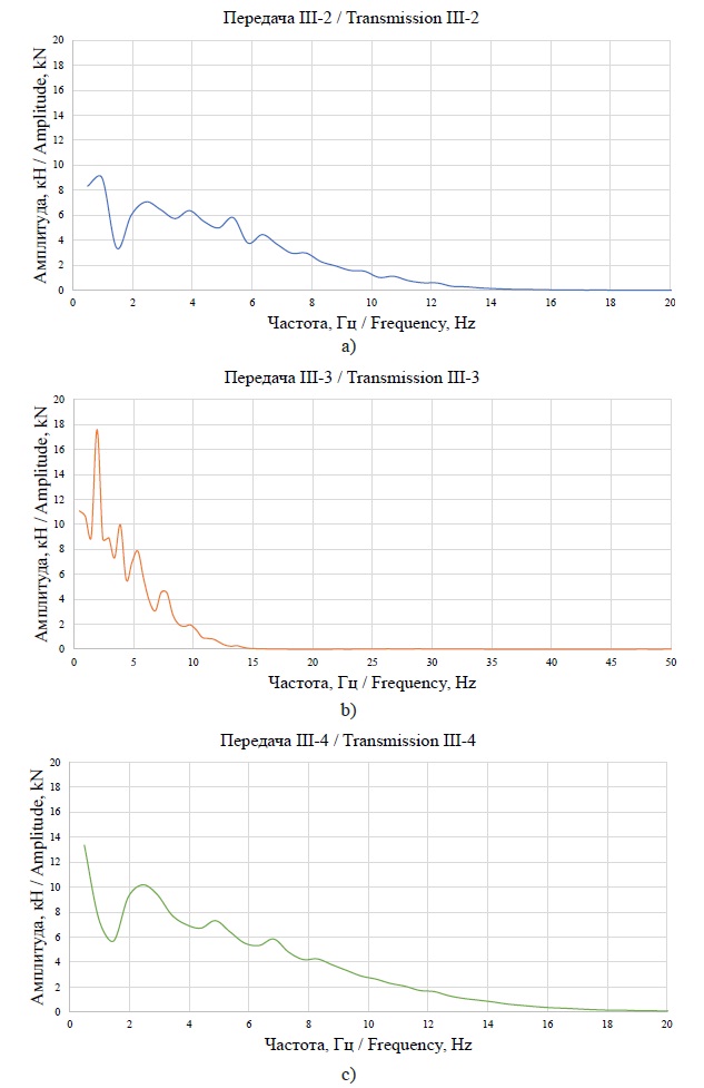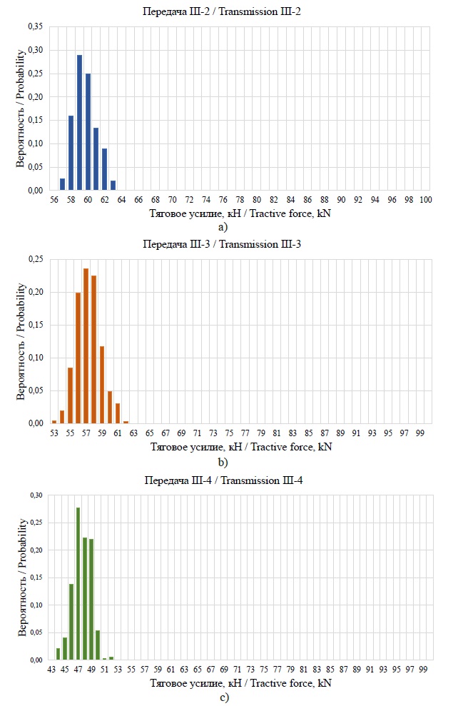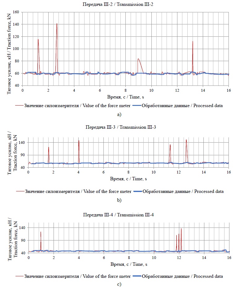 На передаче III-2 (рис. 5a) отмечено шесть кратковременных выбросов значений тягового усилия, при этом пиковое значение достигает 154 кН при установившемся значении тягового усилия ≈60 кН. После обработки цифровым фильтром выбросов больше нет. На передаче III-3 (рис. 5b) отмечено четыре кратковременных выброса значений тягового усилия, при этом пиковое значение достигает 152 кН при установившемся значении тягового усилия ≈57 кН. После обработки выбросы отсутствуют. На передаче III-4 (рис. 5c) отмечено четыре кратковременных выброса значений тягового усилия, при этом пиковое значение достигает 137 кН при установившемся значении тягового усилия ≈48 кН.