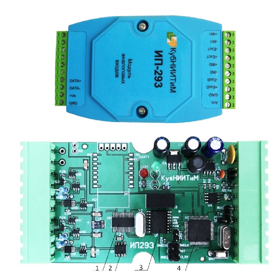 Fig. 4. Analog input module IP-293: 1 – 4-channel ADC AD7734;