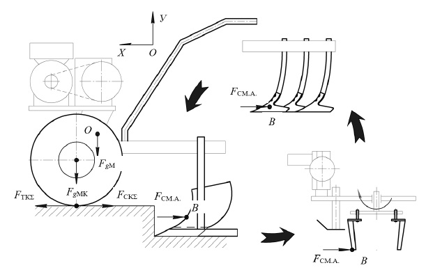 Из анализа условия (1) следует, что для функционирования почвообрабатывающего агрегата необходимо обеспечить преодоление сил FСКΣ и FСМ.А.. Определяющим фактором для преодоления данных сопротивлений, согласно техническому регламенту, является сила тяги FТК на ведущих колесах2.
