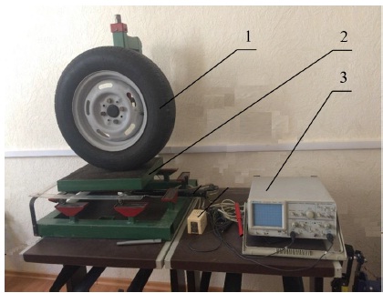 Данный стенд позволяет проводить исследования тягово-сцепных свойств колеса 1 при фиксированном значении давления воздуха в шине с одновременным контролем вертикальной и горизонтальной нагрузок при помощи тензометрической площадки 2 и осциллографа 3.
