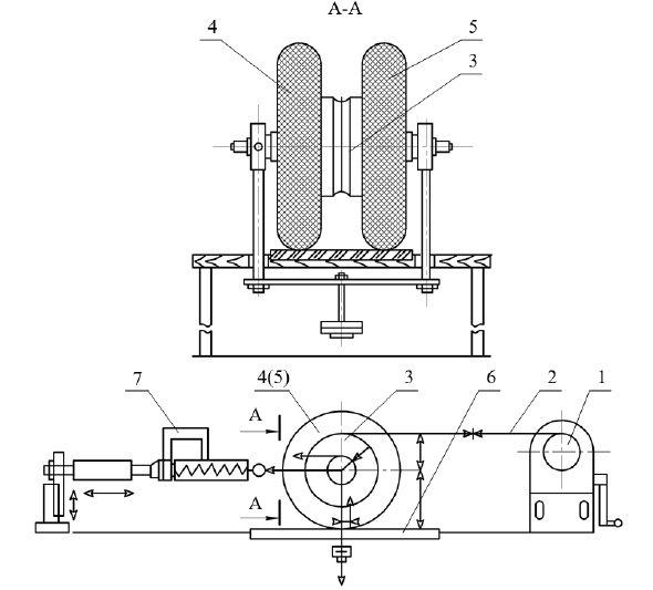 Принцип работы стенда заключается в передаче крутящего момента от ведущего барабана 1 через тяговый канат 2 к ведомому барабану 3 с закрепленными на нем испытуемыми колесами 4 и 5. Ведущие колеса контактируют с имитатором дорожного покрытия 6, связанным с динамометром 7.