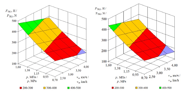 На рисунках 6‒8 представлены частные графические решения уравнений (6) и (7), (8) и (9), (10) и (11) для массы мотоблока 140, 160 и 180 кг соответственно с осями координат FТK1 (FТK2), p и vп. Полученные результаты коррелируют с ранее проведенными исследованиями [28–30].