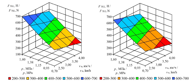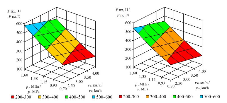 В результате лабораторных испытаний были получены регрессионное уравнение в общем виде (5), его частные решения (6)–(11) и графические модели сил тяги FТK1= f (p; vп) и FТK2 = f (p; vп) (рис. 6–8), показывающие изменение силовых характеристик для различных значений массы пахотного агрегата на каждом ведущем колесе мотоблока.