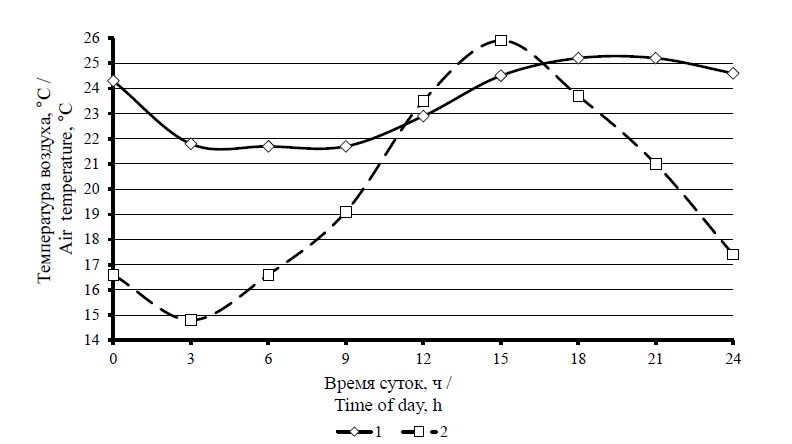 temperature in the cow barn, °С; 2 – expected maximal air temperature in the cow barn, °С;