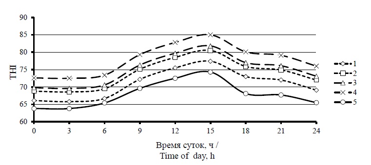 влажности воздуха 90 %; 5 – значения THI вне коровника