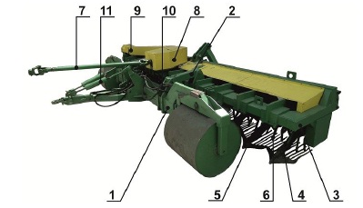 3 – frame; 4 – the rack; 5 – ploughshare with separating gratings; 6 – rotor with rippers; 7 – cardan gear;