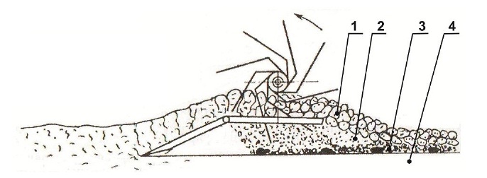 При движении машины по полю лемеха поднимают слой почвы, далее при перемещении вдоль поверхностей лемеха и прутьев сепарирующей решетки происходит его крошение, при этом мелкокомковатая фракция просыпается сквозь решетку, формируя семенной подслой. Дальнейшее формирование семенного подслоя происходит с помощью рыхлителей ротора, которые крошат и рыхлят почву, перемещая ее вдоль сепарирующей решетки. Крупно-комковатая фракция с отдельностями не более 20 мм движется сходом с решетки, образуя надсеменной подслой. Кроме этого, рыхлители ротора в процессе взаимодействия с почвой вычесывают из нее сорные растения, не нарушая их целостности, и транспортируют их на поверхность надсеменного подслоя [7].