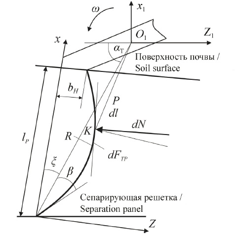 Для данного рыхлительно-сепарирующего устройства z'0 выбирается из условий максимально возможного захвата почвы в начальный момент ее взаимодействия с рыхлителем, что позволяет снизить сгруживание почвы перед ротором [23; 25]. Из рисунка 4 видно, что z'0 = tg(α1 + β1), где β – угол между радиус-вектором носка рыхлителя и касательной к кривой в этой же точке.