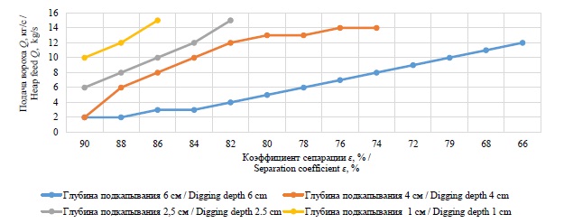 Одним из лимитирующих факторов, способствующих повышению качества уборки корнеклубнеплодов и лука, является несовершенство конструкции рабочих органов, что подтверждают результаты исследований технологического процесса подкапывания клубненосного вороха [6], свидетельствующие о снижении полноты очистки при повышении подачи вороха на сепарирующие устройства уборочной машины при увеличении глубины подкапывания и поступательной скорости движения (рис. 3).
