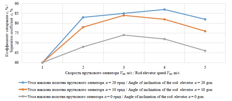 Fig. 4. The dependence of the separation coefficient of the rod elevator ε on the angle of inclination