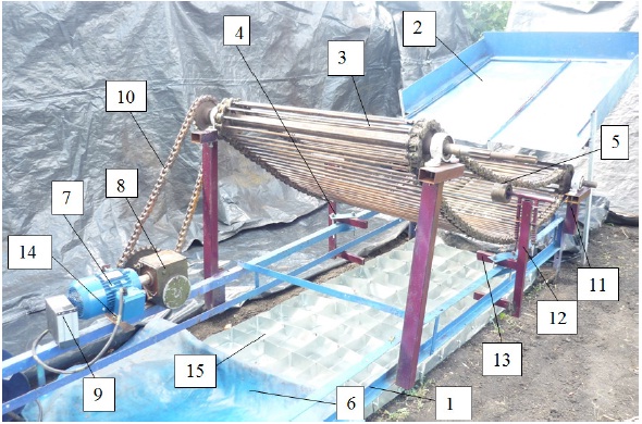 Fig. 2. Separating chain digger: 1 – reversing rubber wheel; 2 – separation sieve; 3 – web agitators;