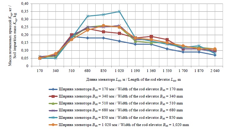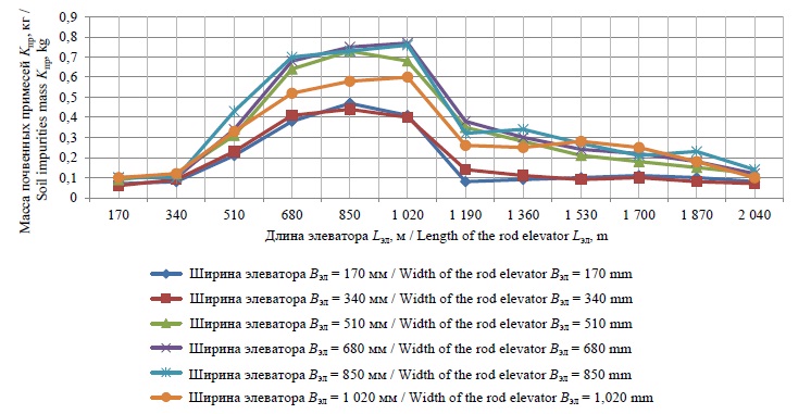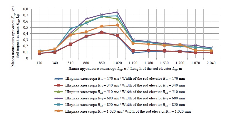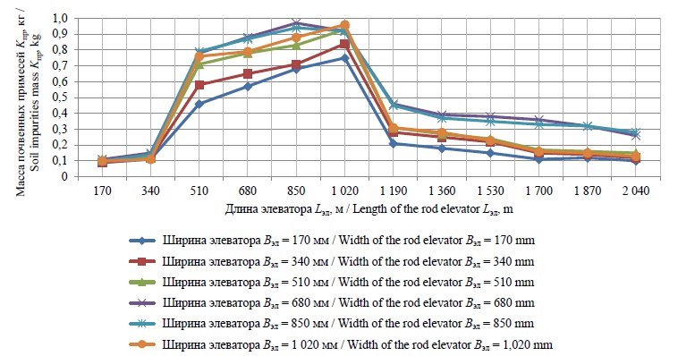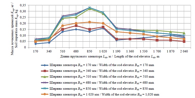По результатам взвешивания просеянной почвы, изъятой из каждой ячейки устройства для сбора примесей и прошедшей через щелевые отверстия пруткового элеватора, определялась зависимость массы просеянных почвенных примесей Kпр по длине Lэл и ширине Вэл пруткового элеватора:
