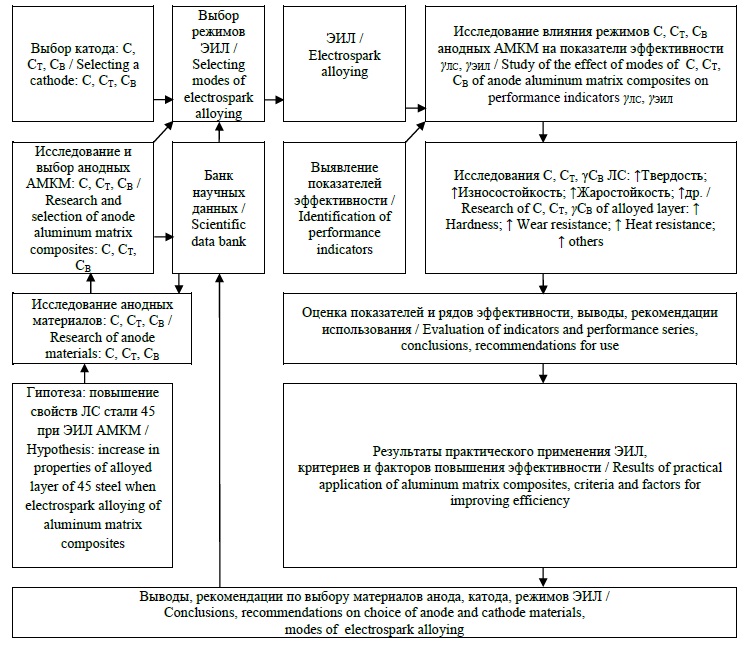 Исследовались алюмоматричные материалы по методологической схеме (рис. 1), исходным звеном которой является формулировка гипотезы повышения свойств ЛС исполнительной рабочей поверхности стали 45 в результате ЭИЛ АМКМ, которая мотивировала создание научного банка данных ряда функциональных АМКМ для исследований с привлечением известных теоретических и практических сведений.